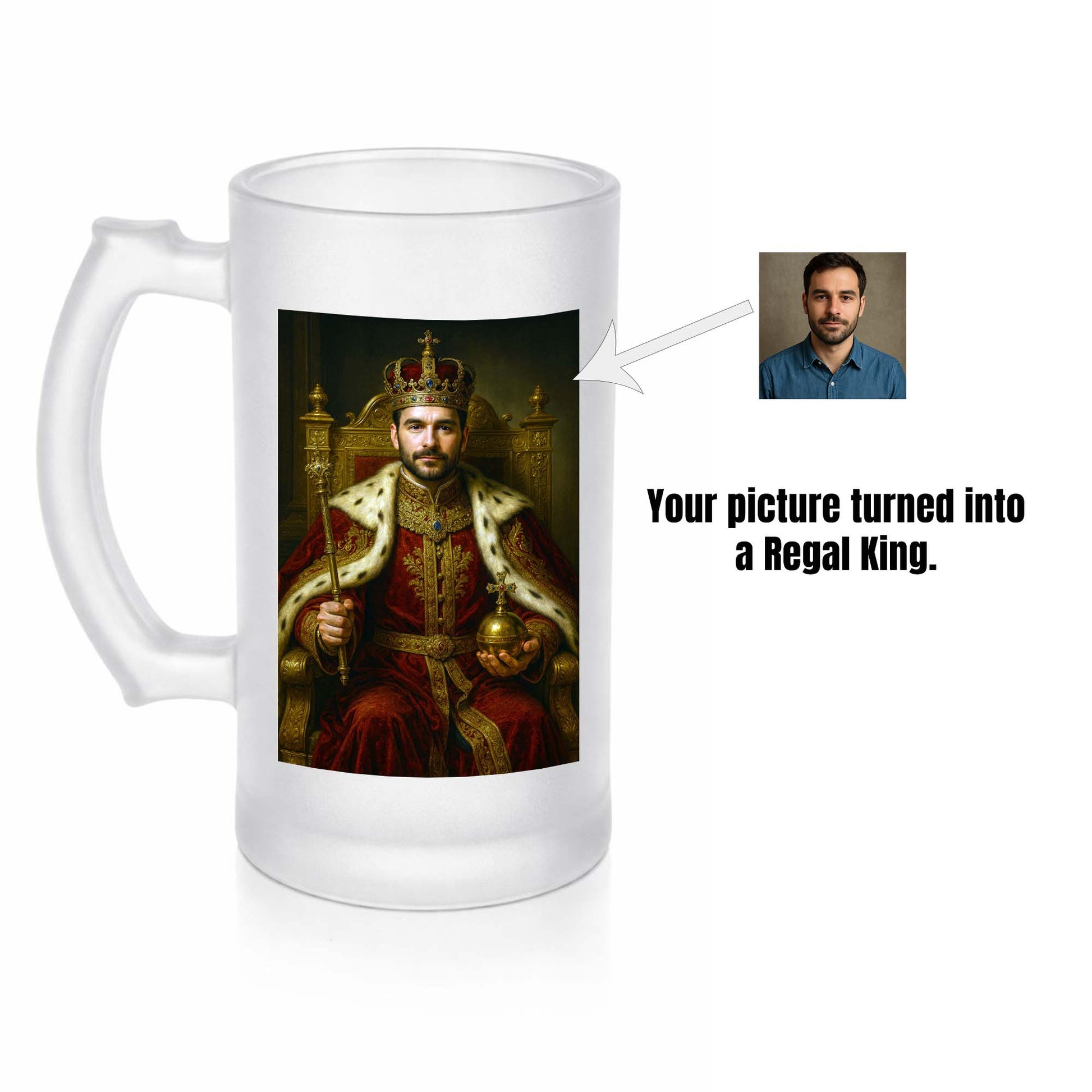 Turn your photo into a regal king portrait printed on a premium frosted glass beer mug. A unique personalised gift for birthdays, Father’s Day, and special occasions.